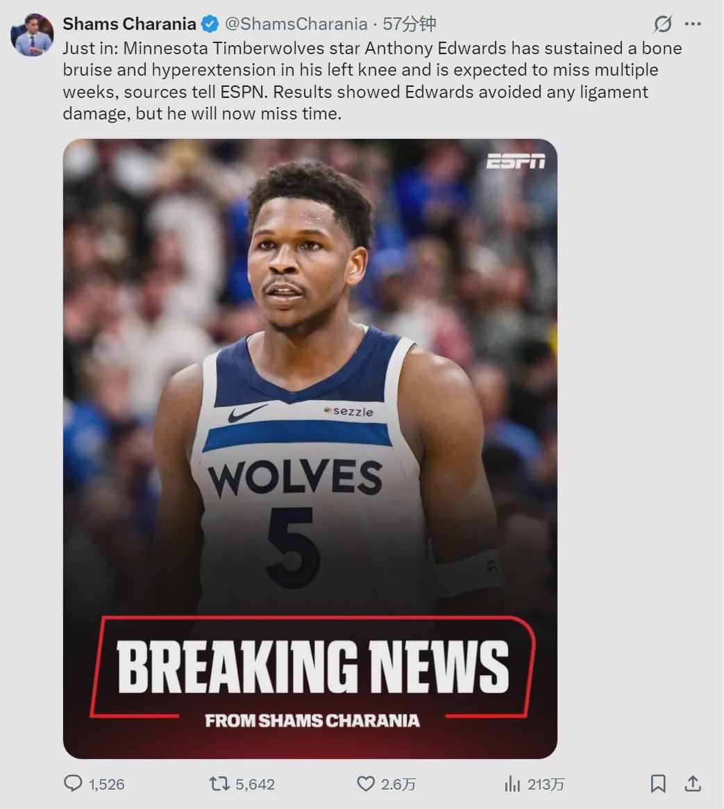 北京时间4月27日凌晨,据NBA名记Shams报道,爱德华兹确诊左膝骨挫伤和过度伸展,将缺席数周!森林狼和掘金的系列赛最晚5月3日结束(G7),也就是一周之后,华子肯定赶不上了。另一个森林狼球员迪温琴佐,因跟腱撕裂赛季报销。